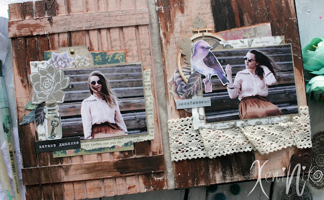 Следующий разворот так же зеленый как и первый. Он меня завораживает. Здесь я как Алиса в зазеркалье..Здесь я так же попыталась поиграться с фактурами. и будто бы вписать фотографии в них.